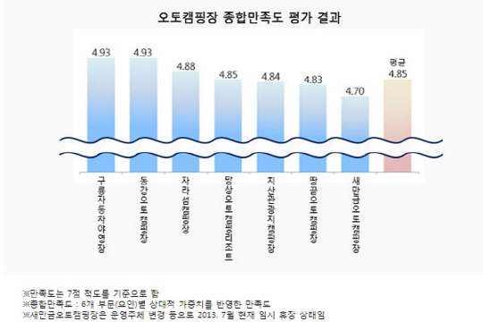 레저와 야외활동에 대한 꾸준한 관심 증가와 더불어 최근 인기 TV 프로그램 '아빠 어디가' 등을 통해 가족 캠핑에 대한 관심이 급증하면서 오토캠핑 이용도 급증하고 있는 추세다. 구룡 캠핑장은 캠핑장 시설, 시설운영 서비스, 서비스체험 만족도에서 각각 4.80, 4.79, 4.86점으로 가장 높은 점수를 받았다. 동강은 주변 환경 만족도에서도 5.21점으로 평가가 가장 좋았다.
