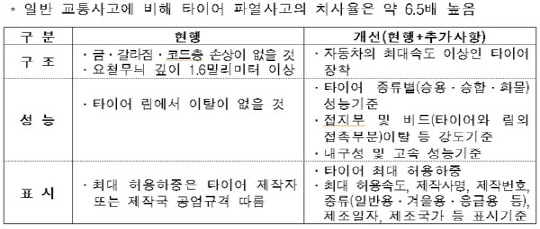 개정안의 주요 내용을 보면 먼저 자동차 타이어 파열 사고를 예방하기 위하여 국제기준 수준으로 타이어의 구조·성능·표시 기준을 강화하고 어린이 통학차량 등의 후진사고를 예방하기 위해 후방감시장치 설치기준을 마련하고 장착을 의무화했다.