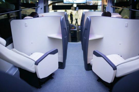 침대버스 견본차량 중 하나는 2개열 18좌석로 제작돼 현재 운행 중인 우등고속버스인 3개열 28석보다 1인당 사용 공간이 대폭 넓어졌다. 이에 따라 등받이도 기존 우등석(128도) 보다 누운 자세에 가깝게 140도까지 젖힐 수 있다.