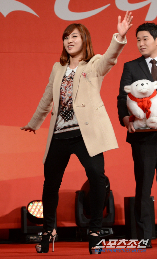 스포츠조선 제정 제18회 코카콜라 체육대상 시상식이 31일 서울 한남동 하얏트호텔 그랜드볼룸에서 열렸다. 우수선수상을 수상한 런던올림픽 펜싱 금메달리스트 김지연이 사회자의 요구에 펜싱스텝 시범을 보이고 있다. 정재근 기자 cjg@sportschosun.com