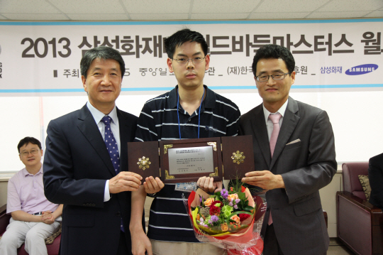 ◇대국 후 열린 월드조 시상식 장면. 삼성화재 김창수 사장이 월드조 우승자인 에릭 루이 7단에게 상패를 전달했다. 참가한 8명에게는 나전칠기로 된 액자가 기념품으로 증정됐다. 왼쪽부터 김창수 삼성화재 사장, 월드 우승자 에릭 루이, 양재호 한국기원 사무총장.