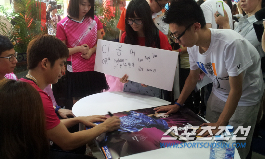 그런가 하면 한 소녀 팬은 이용대 응원문구가 담긴 피켓을 들고 찾아왔는데 적힌 글이 웃음을 자아냈다. 한국어 인터넷 사이트를 찾아서 한글을 그대로 따라 쓴 정성을 기울였는데 맞춤법은 딴판이었다.