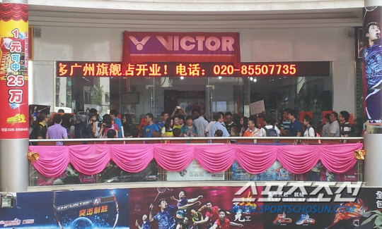 이날 오전 광저우의 스포츠용품 전물 대형 쇼핑몰 '톈허후이'에서 배드민턴 용품브랜드 '빅터'의 직영 1호 매장 개장식이 열렸다.