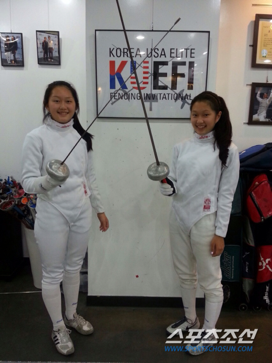미국 로스앤젤레스에서 나고 자란 방윤서(15) 윤제(14· 이상 미국 말보로여중)는 못말리는 열혈 펜싱자매다. 13~15일 제주 서귀포 한국국제학교(KIS) 제주캠퍼스에서 펼쳐지는 한미대학펜싱선수권(2013KUEFI)에 '자원봉사자'로 참가하기 위해 한국을 찾았다. 5년전 재미삼아 시작한 펜싱의 매력에 흠뻑 빠져들었다. 자매의 학교엔 펜싱팀이 없다. 동네에 있는 펜싱클럽에서 일주일에 4~5번 레슨을 받는다. 운동신경이 뛰어난 윤서와 팔다리가 길쭉한 윤제는 지역 연령별 대회에서도 두각을 나타내고 있다. 더욱이 눈길을 끄는 것은 이 중학생 소녀들이 학교에서 최우등상, 우등상을 휩쓸 만큼 성적도 뛰어난, 전도양양한 엘리트 '학생선수(Student-Athlete)'라는 점이다.