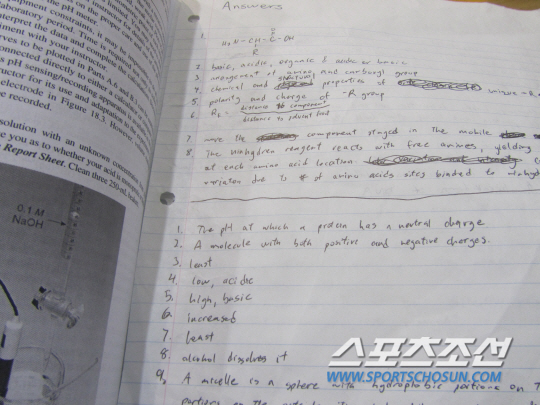 이날 경기를 기다리는 선수석 한켠에서 이어폰을 꽂은 채 '열공'하고 있는 한 선수가 눈에 띄었다. 컬럼비아대 펜싱팀의 한국계 에페 선수 브라이언 로(19)였다. 한눈에 보기에도 복잡해보이는 화학공식들로 빼곡한 두꺼운 책을 열심히 들여다보고 있었다. "토요일에 화학시험이 있다. 학교에서 이번 대회 때문에 일정을 하루 미뤄줬다. 시험공부를 할 시간이 부족하다"고 이유를 밝혔다. 브라이언에게 여름방학은 부족한 공부를 보충할 절호의 기회다. 화학시험을 앞두고 한국행 비행기 안에서도 내내 공부를 했다. 이날도 경기 틈틈이 책을 펼쳐들고 열심히 공부를 하고 있었다.