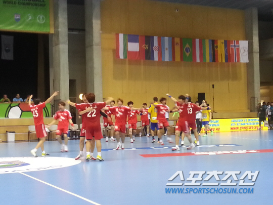 ◇한국 선수단이 17일(한국시각) 헝가리 부다요시 스포츠홀에서 가진 루마니아와의 IHF세계청소년선수권 예선 B조 최종전에서 승리한 뒤 환호하고 있다.