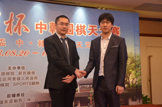◇한국 천원 박영훈 9단(오른쪽)과 중국 천원 천야오예 9단이 20일 제17회 박카스배 한-중천원전 개막식에서 선전을 다짐하고 있다. 사진제공=신민완바오