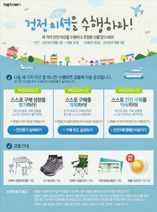 국민체육진흥공단(www.kspo.or.kr)이 발행하는 체육진흥투표권 수탁사업자인 스포츠토토의 공식온라인 발매사이트 베트맨(www.betman.co.kr)이 8월 한 달간 실시하는 건전화 프로그램 참여 이벤트 '건전미션을 수행하라' 마감이 임박했다.
