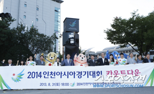 인천아시아경기대회조직위원회가 2014년 인천아시안게임 개막 1년여를 앞두고 8월 31일 오후 6시40분 인천시청 앞에서 공식 카운트다운 행사를 열었다. 공식후원업체인 티쏘(Tissot)가 제작한 아시안게임 카운트다운 시계탑이 점등됐다. 시계탑에 새겨진 'D-384'를 시작으로 본격적인 대회 카운트다운에 들어갔다.