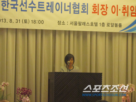 ◇지난 8월31일 한국선수트레이너협회 제5대 회장에 취임한 어은실 박사가 취임사를 하고 있다.