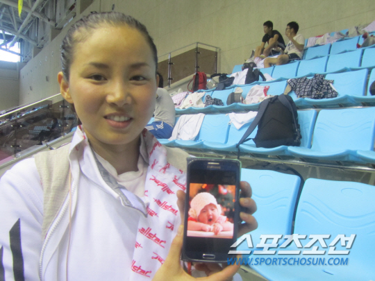 '엄마검객 '남현희가 6일 펜싱국가대표선발전에서 백일을 갓 지난 딸 하이 사진을 들어보이고 있다.