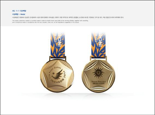 조직위가 22일 발표한 시상 부분 디자인은 금-은-동메달을 비롯해 상장과 케이스, 참가메달, 참가증서 및 케이스, 시상대, 메달 받침대, 꽃다발, 말(馬)리본 등 12종이다. 올해 1월부터 8월말까지 조직위원회와 인천지역 디자인개발 전문회사가 공동작업한 디자인은 국내 최고 수준의 전문가들의 4차례에 거친 심도 있는 자문을 받은 결과물로 8월 19일 아시아올림픽평의회(OCA)로부터 최종승인을 받았다.