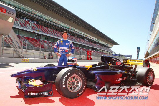 ◇지난 16~18일 스페인 바르셀로나 카탈루냐 서킷에서 열린 금호타이어의 F1 타이어 첫 필드 테스트에 참가한 한국인 드라이버 문성학이 Auto GP 머신을 배경으로 포즈를 취하고 있다. 사진제공=금호타이어