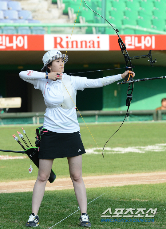 양궁 국가대표팀이 야구장에서 성대결을 벌였다. 8일 인천 문학야구장에서 양궁 국가대표팀이 NC와 SK의 프로야구 경기를 앞두고 관중 및 소음 적응훈련을 했다. 그라운드에 나온 기보배가 70미터 과녁을 향해 화살을 조준하고 있다. 남녀 양궁대표팀 6명(오진혁, 임동현, 이승윤,기보배, 윤옥희, 장혜진이)은 70미터 거리에서 단체전 성대결을 벌였다. 인천=정재근기자 cjg@sportschosun.com
