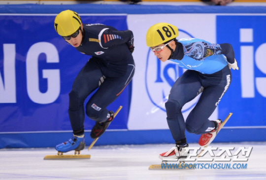 안현수 신다운 충돌에도 8강 진출, 3일 오전 서울 목동 아이스링크에서 2013/2014 삼성 ISU월드컵 쇼트트렉대회 남자 1500m 예선이 열렸다. 4조에 출전한 러시아 안현수(러시아명 빅토르 안)와 한국 이한빈(왼쪽)이 힘차게 트렉을 돌고 있다. 목동=김경민 기자 kyungmin@sportschosun.com / 2013.10.03.