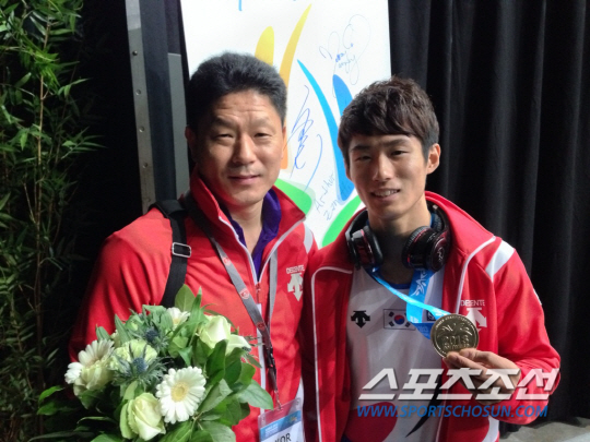 ◇양학선이 앤트워프 세계선수권 도마종목 2연패를 달성한 직후, 주영삼 체조대표팀 감독(왼쪽)과 함께 금메달을 꺼내보이며 환한 웃음을 지었다.