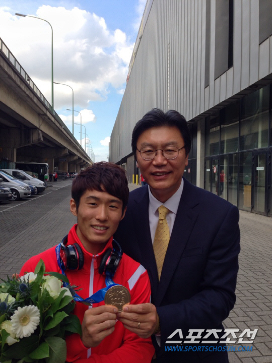◇양학선의 쾌거로 교민들도 활짝 웃었다. 김창범 주벨기에 유럽연합 대사(오른쪽)가 세계선수권 2연패 쾌거를 이룬 양학선과 함께 포즈를 취했다.