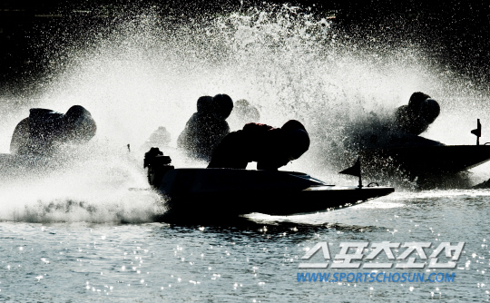가을 햇살이 눈 부셨던 지난 3일 경기도 하남시 미사리 경정장에서 경주 보트들이 보석처럼 빛나는 물보라를 뿜어내며 달리고 있다. 미사리 =정재근기자 cjg@sportschosun.com
