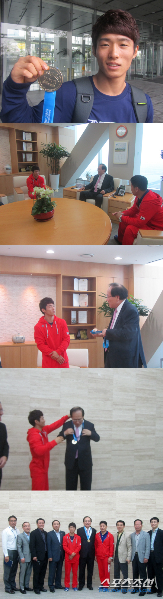 8일 오전 인천공항을 통해 귀국한 양학선이 기자회견을 마치자마자 향한 곳은 인천 송도 포스코건설 사옥이었다. 물심양면 지원을 아끼지 않은 정 회장에게 '금메달' 인사를 드리기 위해서다. "날마다 스포츠 뉴스가 쏟아지더라." 정 회장이 흐뭇한 얼굴로 양학선을 맞았다. '올림픽 챔피언'의 세계선수권 2연패를 기뻐하고, 축하했다. 1차시기, 2차시기 기술에 대해 이야기를 나눴다. "1차 시기 '양학선' 기술에서 충분한 점수가 나왔기 때문에 2차 시기 굳이 무리할 필요가 없었다"(김대원 체조협회 전무) "착지에서 두발을 나가도 금메달이 가능한 점수였다"(김동민 체조협회 부회장)는 임원들의 설명에 고개를 끄덕였다.