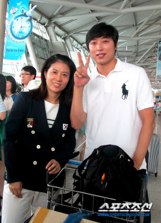 | ◇여자탁구 레전드 김경아가 15일 건강한 아들을 순산했다. 사진은 지난해 여름 런던올림픽 출국 직전 인천공항에서 남편 박명규씨와 환하게 웃고 있는 김경아. |