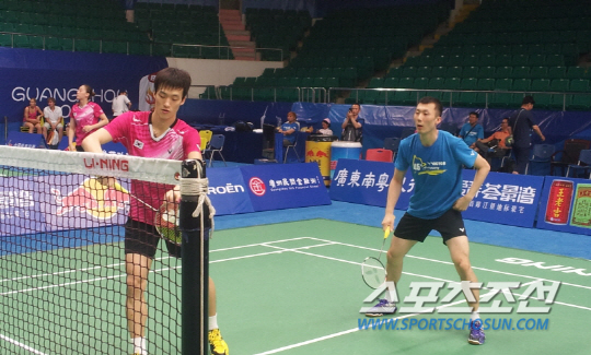 | 유연성(오른쪽)이 신백철과 남자복식으로 뛰었던 지난 8월 세계선수권에서 훈련을 하고 있다. 최만식 기자 |