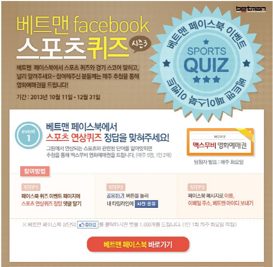 국민체육진흥공단(www.kspo.or.kr)이 발행하는 체육진흥투표권 수탁사업자인 스포츠토토 공식 온라인 발매 사이트 베트맨(www.betman.co.kr)이 12월 31일까지 베트맨 페이스북에서 실시하고 있는 '스포츠 퀴즈 시즌3'가 토토팬들의 뜨거운 호응을 얻고 있다.