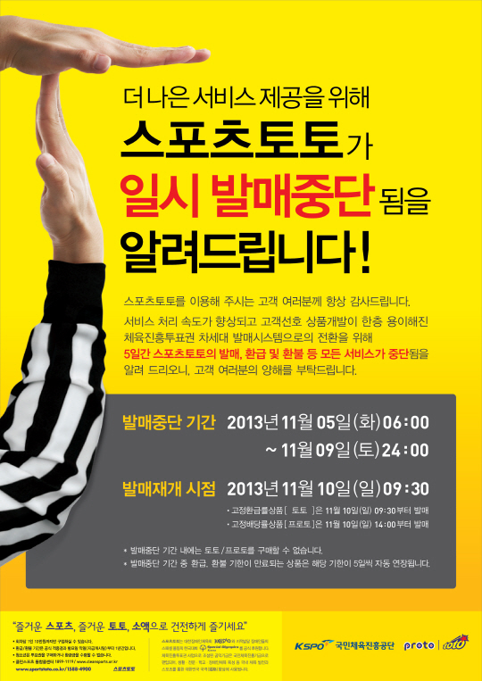 국민체육진흥공단(www.kspo.or.kr)이 발행하는 체육진흥투표권 수탁사업자인 스포츠토토(www.sportstoto.co.kr)가 '차세대 발매시스템 전환'에 따른 일시 발매 중단에 들어간다. 스포츠토토측은 "이번 일시 발매 중단이 새로 개발 완료된 체육진흥투표권 차세대 발매시스템 전환으로 스포츠토토를 이용하는 고객들에게 보다 안정적인 서비스를 제공하기 위한 것이다"고 밝혔다.