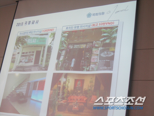 이날 오후 속행된 국감에서도 우슈협회는 핫이슈였다. 유은혜 민주당 의원은 아예 동영상을 공개했다. 우슈협회장 사진을 보여주자 베트남 호치민 마사지업소 종업원이 직접 "비오는 날 저녁에 이분과 4명이 함께 왔었다"고 증언했다. 김 회장은 거듭 "보고받지 못했다. 현재 감사중인 것으로 안다"라고 답변했다. 박위진 문체부 체육국장 역시 "우슈협회는 현재 감사중"이라고 확인했다. "신속한 감사를 진행해달라. 내부 단순정황이 아니라 이렇게 구체적인 물증까지 나와있다"는 말로 조속한 조치를 촉구했다. 사진, 동영상 등 잇단 증거가 제출되자 국감장 분위기는 후끈 달아올랐다. 안민석 민주당 의원은 의사진행 발언을 통해 "김 회장은 이에리사, 유은혜 의원이 제기한 의혹을 본인에게 확인한 후 사실일 경우 당장 관두라고 하셔야할 것"이라고 압박했다. "우슈협회장은 문체부 국장, 대한체육회 사무총장까지 지낸 분으로 알고 있다. 본인이 사실이 아니라고 하면 국감장에서 억울함에 대해 직접 해명할 기회를 드리는 게 맞을 것"이라고 주장했다. 전영지 기자 sky4us@sportschosun.com