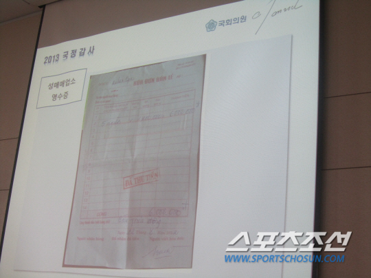 이 의원은 스포츠계 자정이 강조되는 시점에 한 체육회 산하 경기연맹의 도덕적 해이를 지적하고 나섰다. "우슈협회가 지난해 8월 베트남 호치민에서 열린 국제대회에서 5명의 임직원이 성매매 업소에 갔다는 말을 들었다. 경악을 금치 못했다"며 해당 사건을 조목조목 폭로했다. 현지 유명 마사지숍 사진과 영수증 등 증빙자료에 의원들과 언론의 시선이 집중됐다. 이 의원은 "선수들을 데리고 나간 국제대회에서 임원들이 이런 자리에 갔다는 것만으로도 퇴출돼 마땅하다"고 목소리를 높였다. 김 회장은 "현재 감사를 실시중이다. 상황을 보고 결정하겠다"고 신중하게 답했다.