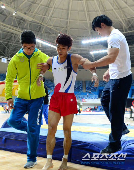 21일 인천남동체육관에서 펼쳐진 남자체조 단체전 연습 도중 아찔한 부상을 당했다. '주종목' 도마 경기를 앞두고 몸 풀듯 가볍게 연습하던 중, 착지하다 오른발목을 삐끗했다. 단체전 도마경기를 치른 직후 병원으로 후송됐다. 대한민국 최초의 체조 올림픽 챔피언이자 세계선수권 2연패를 이룬 '영웅' 양학선의 부상 소식에 체조팬들의 걱정이 쏟아졌다. 양학선은 부상을 우려하자 "괜찮아요. 계속 얼음찜질 하고 있어요. 뒤꿈치로 디딜 때 좀 아프긴 한데, 압박붕대 감고 뛰면 괜찮을 거예요"라며 씩씩하게 웃었다.