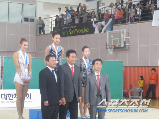 ◇인천전국체전 리듬체조 개인종합 은메달을 딴 김윤희(왼쪽 끝)이 금메달 손연재 동메달 이다애 등 후배들과 나란히 섰다. 송영길 시장(앞줄 가운데)이 직접 시상에 나섰다.