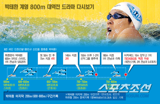 이날 '만화'같은 역영은 기록으로도 증명됐다. 계영 800m 가운데 박태환이 역영한 600~800m, 200m 구간기록은 1분44초44다. 자신의 한국최고기록(1분44초80)보다 빨랐다.