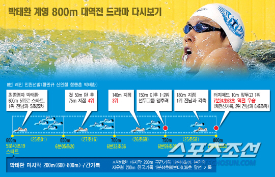박태환은 2008년 이후 5년만에 출전한 전국체전에서 월드클래스의 존재감을 유감없이 과시했다. 자유형 400m(19일)계영 400m(20일) 자유형 200m(21일) 계영 800m(22일) 나흘 연속 금메달 퍼레이드를 펼쳤다. 대회 마지막날인 24일 혼계영 400m에서도 동메달을 따내며 출전한 모든 종목에서 메달 획득에 성공했다. 특히 계영 800m에서 괴력을 발휘하며 인천선발팀을 우승으로 이끄는 투혼을 발휘했다. 인천선발팀의 마지막 영자로 나선 박태환은 200m를 1분44초44에 주파하는 기적같은 레이스를 펼쳤다. 자신의 한국최고기록 1분44초80보다도 빨랐다.
