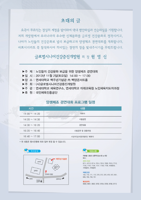 사단법인 글로벌 시니어건강증진개발원(회장 원영신)은 내달 2일 오후 2시부터 3시간동안 연세대학교 백주년기념관 내 백양콘서트홀에서 '노인들의 건강문화 보급을 위한 양생체조 경연대회'를 개최한다.