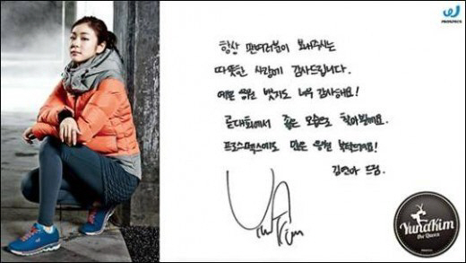 카드에서 김연아는 "항상 팬 여러분이 보내주시는 따뜻한 사랑에 감사드립니다. 예쁜 응원 배지도 정말 감사해요!"라고 전했다.