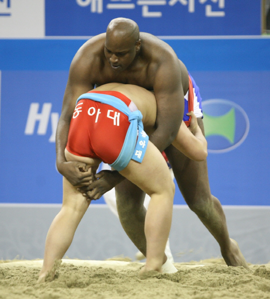 | ◇전선협(왼쪽)이 14일 충남 서산 농어민문화체육센터에서 열린 2013년 천하장사씨름대축제 세계씨름친선교류전에서 2m33의 커티스 존슨과 경기를 펼치고 있다. 사진제공=대한씨름협회 |