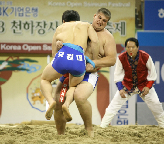 | ◇러시아 엘켈(오른쪽)이 세계씨름친선교류전에서 하관수를 들어 올리고 있다. |