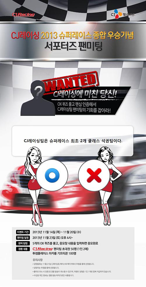 참가신청은 CJ레이싱팀 페이스북(facebook.com/CJRACINGTEAM)에서 OX퀴즈를 풀어야만 응모할 수 있으며, 서포터즈 팬미팅 초대권(50명, 동반 1인)과 투썸플레이스 기프티콘(100명)을 증정한다.
