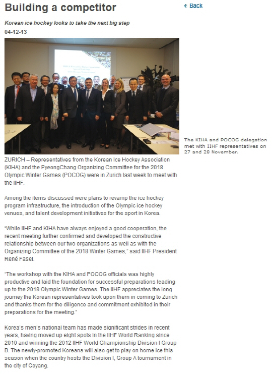 IIHF는 홈페이지에 게재한 기사를 통해 KIHA와의 특별 워크숍 결과를 긍정적으로 평가하며 한국 아이스하키의 평창 동계 올림픽 출전을 위한 사업 계획을 상세히 소개했다. 르네 파젤 회장은 " 대단히 생산적인 만남이었고 평창 동계 올림픽의 성공을 위한 토대를 만들 수 있었다"고 KIHA와의 특별 워크숍에 대한 만족감을 드러냈다. IIHF는 한국 아이스하키가 대표팀 경기력 향상을 목표로 특별 강화 프로그램을 진행할 계획이고 그 첫 단계로 각급 대표팀을 총괄할 지도자를 선임할 것이라고 전했다. 또 남녀 대표팀의 실전 경험 축적을 위해 세계적인 강팀과의 평가전과 장기 해외 전지훈련을 추진할 것이라고 소개했다. IIHF는 특별 워크숍에서 한국 아이스하키 발전을 이끌 수 있는 우수 지도자를 추천하고 향후 경기력 발전 프로그램을 공동 진행하겠다는 뜻을 밝힌 바 있다.