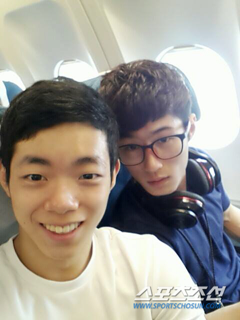 ◇지난 10월 벨기에 앤트워프 세계체조선수권을 위해 출국하는 비행기 안에서 '도마의 신' 양학선과 '차세대 에이스' 박민수가 함께 찍은 셀카. 한양대 1학년 박민수는 생애 첫 세계선수권에서 남자대표팀 선수 중 유일하게 개인종합 결선진출에 성공했다. 박민수의 한양대가 내부적으로 체조팀 해체를 결정했다.