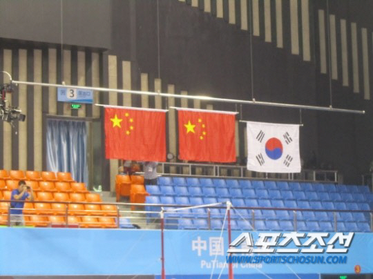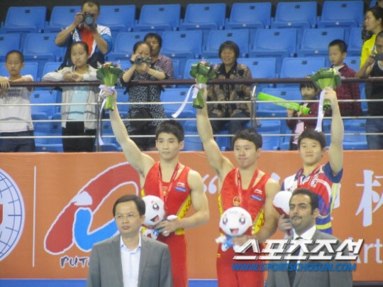 ◇지난해 11월 11일 중국 푸톈에서 펼쳐진 아시아체조선수권에서 중국선수들에 이어 개인종합 3위에 오른 한국의 고예닮(오른쪽 끝)이 시상식 직후 꽃다발을 높이 든 채 미소를 지어보이고 있다