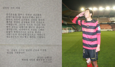 이런 김원일에게 '깜짝편지'가 도착했다. 군 시절 감히 바라볼 수 조차 없었던 '별'에게서 날아온 격려 편지였다. 이영주 해병대 사령관(중장)은 최근 김원일 앞으로 보낸 편지에서 '극적인 결승골로 포항을 클래식 정상에 올려놓은 김원일 선수의 쾌거를 해병대 전장병과 함께 진심으로 축하한다'고 치하했다. 그는 '마지막까지 최선을 다하는 불굴의 해병정신으로 모군을 빛냄을 자랑스럽게 생각한다'며 격려했다. 김원일은 자신의 페이스북을 통해 편지와 함께 '너무 영광스럽다. 사령관님께서 예비역 병장에게'라는 메시지를 남기며 기쁨을 숨기지 않았다. 김원일은 "군 시절 축구를 잘해서 사단장님과 식사 한 번 해본 정도가 전부"라면서 "군 생활 동안 쳐다보기도 힘들었던 높은 분에게 편지까지 받다니 감개무량하다"고 웃었다. 오는 20일 해병 부대 정신교육에도 강사로 나설 예정인 김원일은 "앞으로도 해병대 출신이라는 이름이 부끄럽지 않도록 그라운드 안팎에서 최선을 다하겠다"고 다짐했다.
