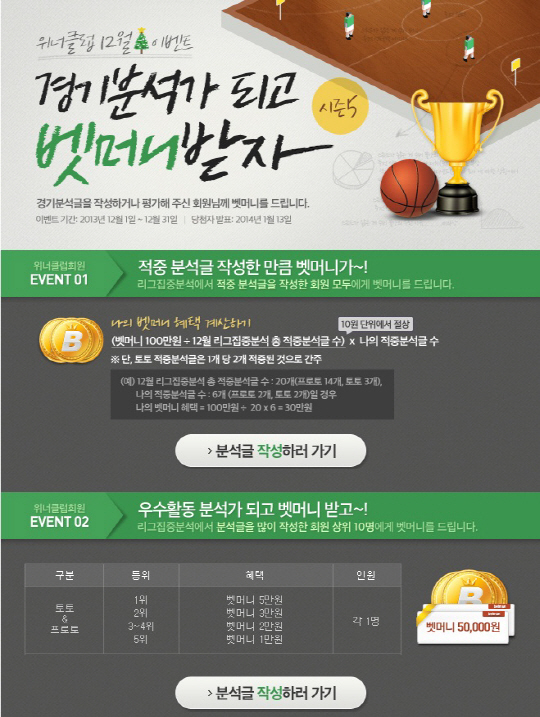 국민체육진흥공단(www.kspo.or.kr)이 발행하는 국민체육진흥투표권 수탁사업자인 스포츠토토의 공식 온라인 발매사이트인 베트맨(www.betman.co.kr)이 실시하는 위너클럽 12월 이벤트 '경기분석가 되고 벳머니 받자!'가 토토팬들의 뜨거운 호응을 얻고 있다.