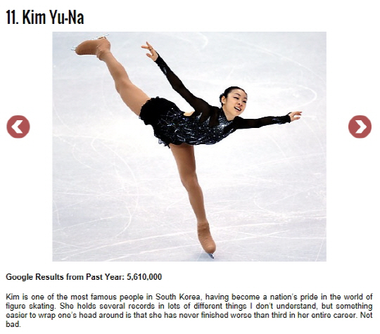 김연아 11위 소식에 네티즌은 "세레나 윌리엄스 1위, 김연아 11위 세계가 인정한 여제", "김연아 11위, 동양인 중 유일", "김연아 11위, 세계가 검색하는 그 이름", "세레나 윌리엄스 1위 이은 김연아 11위, 자랑스러운 한국인" 등 반응을 보였다.<스포츠조선닷컴>