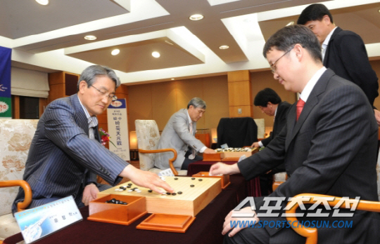 ◇박승호 포항 시장(왼쪽)이 지난 2010년 7월 10일 포항 처송대에서 열린 제14회 한-중 바둑 천원전 개막식에서 유창혁 9단과 대결하고 있다. 포항=최문영 기자 deer@sportschosun.com