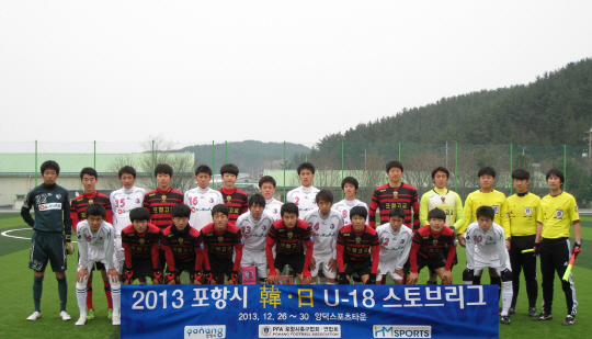 | ◇포항제철중과 세레소 오사카 18세 이하팀이 지난해 12월 26일 포항시 양덕축구장에서 열린 한-일 18세 이하 스토브리그 첫 경기에 앞서 포즈를 취하고 있다. 사진제공=HM스포츠 |