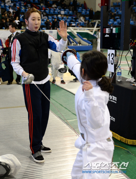 2014 제1회 대한펜싱협회장배 전국 남여 클럽 동호인 펜싱선수권대회가 12일 잠실학생체육관에서 열렸다. 런던올림픽 여자 사브르 개인전 금메달리스트 김지연이 초등부 선수에게 원포인트 클리닉을 하고 있다. 잠실학생체=허상욱 기자 wook@sportschosun.com/2014.01.12/