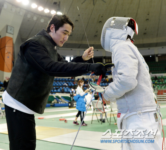 2014 제1회 대한펜싱협회장배 전국 남여 클럽 동호인 펜싱선수권대회가 12일 잠실학생체육관에서 열렸다. 런던올림픽 사브르 남자단체전 금메달리스트 김정환이 초등부 선수에게 원포인트 클리닉을 하고 있다. 잠실학생체=허상욱 기자 wook@sportschosun.com/2014.01.12/