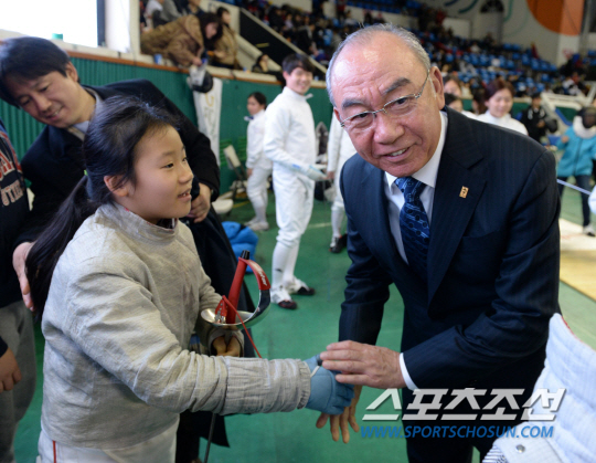 손길승 대한펜싱협회장이 2014 제1회 대한펜싱협회장배 전국 남여 클럽 동호인 펜싱선수권대회 현장에서 초등부 선수의 고사리손을 잡으며 따뜻하게 격려하고 있다. 잠실학생체=허상욱 기자 wook@sportschosun.com/2014.01.12/