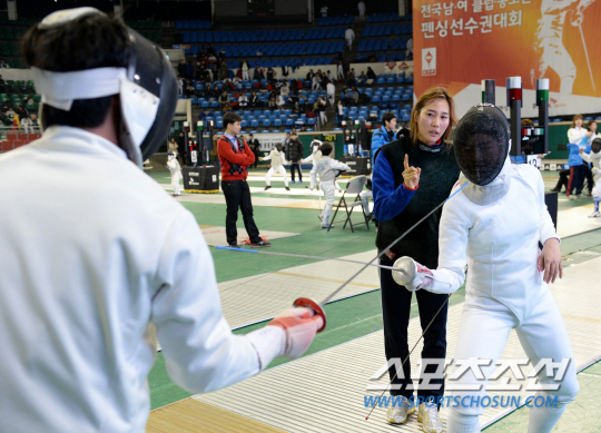 2014 제1회 대한펜싱협회장배 전국 남여 클럽 동호인 펜싱선수권대회가 12일 잠실학생체육관에서 열렸다. 여자 플뢰레 국가대표 전희숙이 선수들에게 원포인트 클리닉을 하고 있다. 잠실학생체=허상욱 기자 wook@sportschosun.com/2014.01.12/